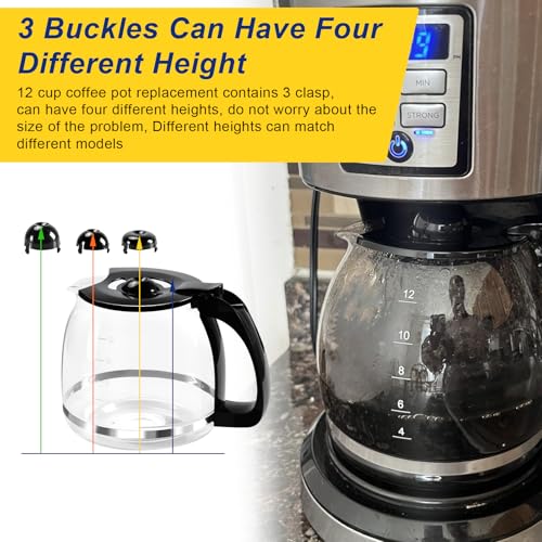Three Buckle Designs: 12 cup coffee pot replacement contains 3 buckles, can have different heights, do not worry about the size of the problem. Different heights can match different models. The 12 cup coffee carafe height is 149 mm / 58.66 inch, width is 189 mm / 74.4 inch, bottom is 146 mm / 57.5 mm, bottommost is 97 mm / 38.2 inch. Please check the model number before ordering