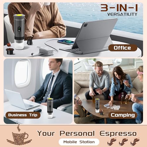 Upgraded 3-in-1 Portable Espresso Maker: Brew Freedom Anywhere. This mini espresso maker machine works with ground coffee, NS & DG capsules, allowing you to switch brew styles anytime without the need for costly proprietary pods. The built-in LED display clearly shows heating countdown, real-time temperature, and battery level for effortless operation