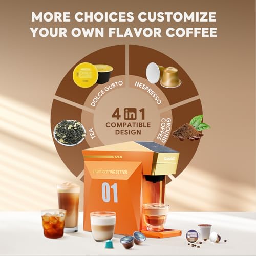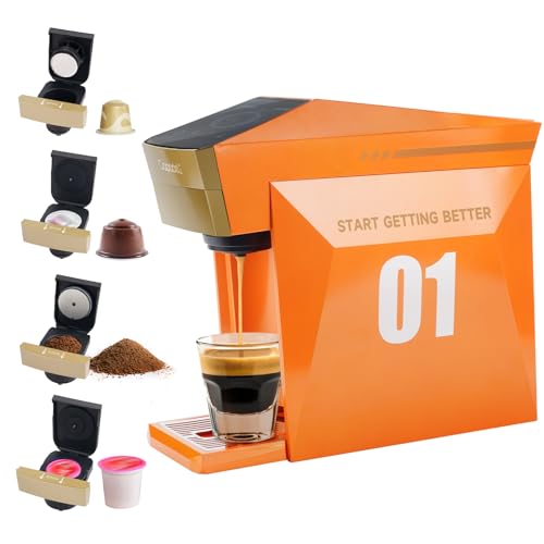 4 In 1 Single Server Coffee Maker, Mini Coffee Machine for Nespresso Original/K cups/Dolce Gusto Original/Ground Coffee, 19 Bar Espresso Machine Fit for Home Office, Orange