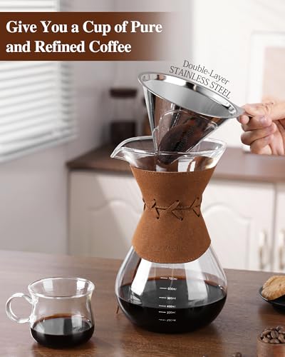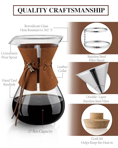 BOILMERIT Pour Over Coffee Maker Set with Double-Layer Stainless Steel Filter, 28 oz, 5-Cup Pour Over Coffee Pot with Leather Collar, Heat Resistant Glass Coffee Carafe Brewer with Cork Lid for Gifts