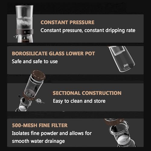 Cold Brew Drip Tower, Iced Coffee Maker, with Adjustable Speed Dripper, Stainless Steel Stand and Borosilicate Glass Pot, Coffee Lover Gift, Makes 2-4 Cups Coffee