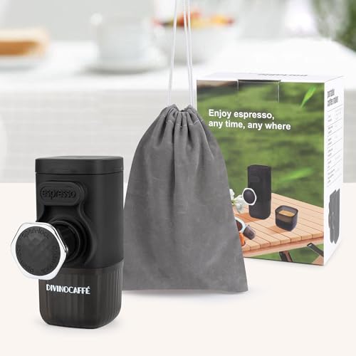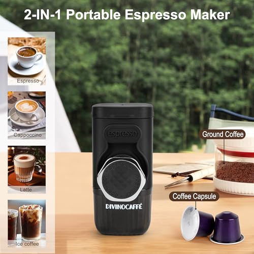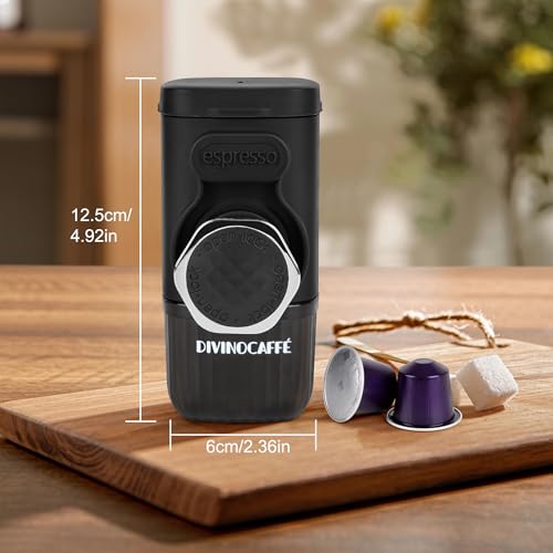 DIVINOCAFFÉ Portable Mini Espresso Machine, Compatible with Capsules and Coffee Powder, Small Travel Coffee Maker, Manually Operated, 18 Bar Pressure, Perfect for Camping