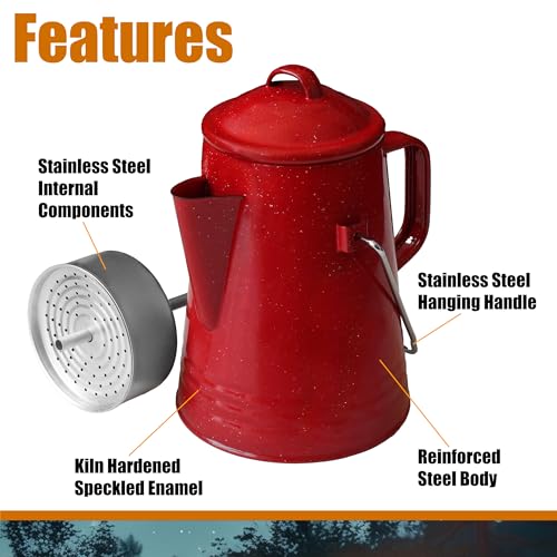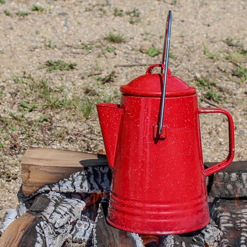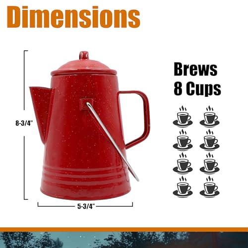 Grip Coffee Percolator (Red) – Durable Glazed Enamel Steel – Prepare Coffee Over the Fire – Camping, Hiking, Backpacking, Fishing, Hunting – (8 Cups)