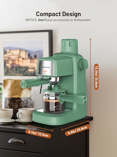 SPACE SAVING & EASY TO USE – This compact coffee maker is smaller than most. Dimensions are 13″ H x 7.7″ W x 10″ D, weight only 4.5 lbs. Fits any kitchen while maintaining key features such as heat control, bar pressure, and milk froth. BPA Free. Robust and low noise, suitable for all families. (Do not put accessories in the dishwasher)
