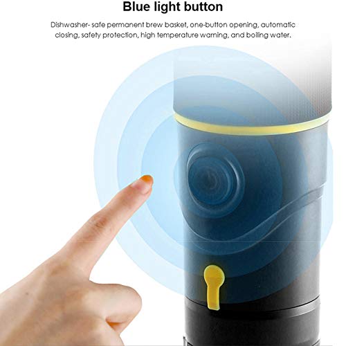 Blue light button: Dishwasher- safe permanent brew basket, one button opening, automatic closing, safety protection, high temperature warning, and billing water.