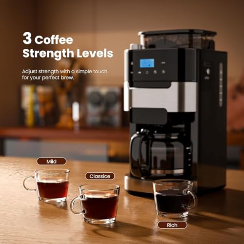 【Customizable Coffee Strength】Choose from low, medium, or high presets to adjust your coffee’s strength. Whether you prefer a light brew or bold espresso-like coffee, this coffee maker with grinder built-in gives you full control over your perfect cup.