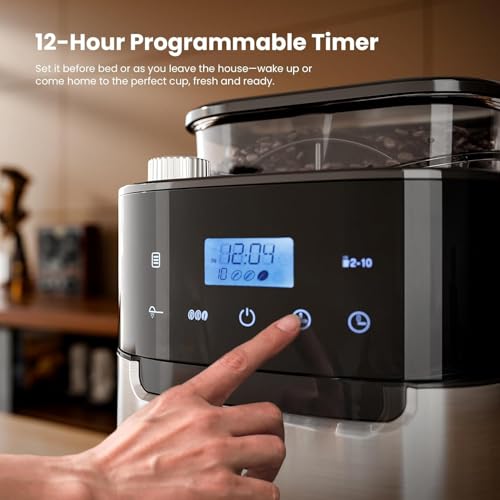 【12-Hour Programmable Timer】Wake up to fresh coffee with the 12-hour timer on this grind and brew coffee maker. Set your desired brew time and enjoy the convenience of a pre-scheduled, automatic brew—ideal for busy mornings or late-night coffee lovers.