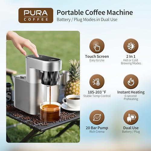 pura coffee Portable Electric Coffee Machine, 20 Bar Travel Espresso Maker with Ground Coffee, Rechargeable, Instant Heating, 6.1oz Water Tank, for Car, RV, Camping, Hiking, Office, Home