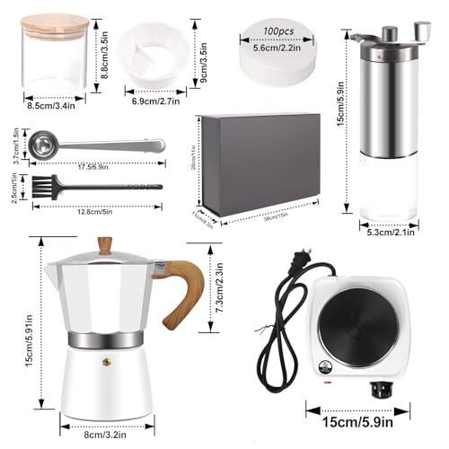 Vaolvpant 7-in-1 Aluminum Moka Pot Set with Electric Stove Hand Grinder Moka Dispenser Classic Stovetop Espresso Coffee Maker 150ml 5oz Mocha Express Portable Camping Travel Cafe Makers 3 Cup