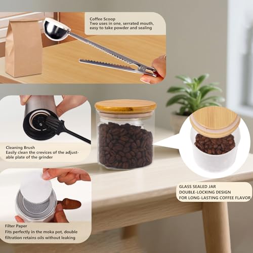 Portable Gift Box Set: This 7-in-1 coffee set is truly a complete solution from beans to finished product. 38cm/14.96in compact design with dedicated storage space, ready to use for travel and camping. Includes 3cup moka pot, electric stove, hand crank grinder, powder dispenser, glass sealing jar, 100 filters, cleaning brush, spoon holder