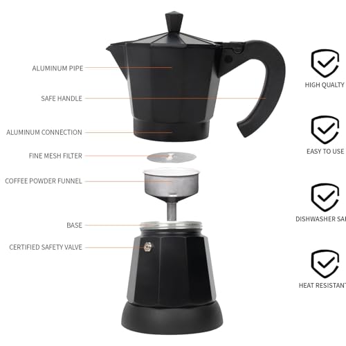Safe And Comfortable Use Experience: The coffee machine design includes a heat-resistant handle and a safety valve to ensure your safety and comfort when pouring coffee. The flat and wide base helps distribute heat evenly, giving you a pleasant coffee-making experience.